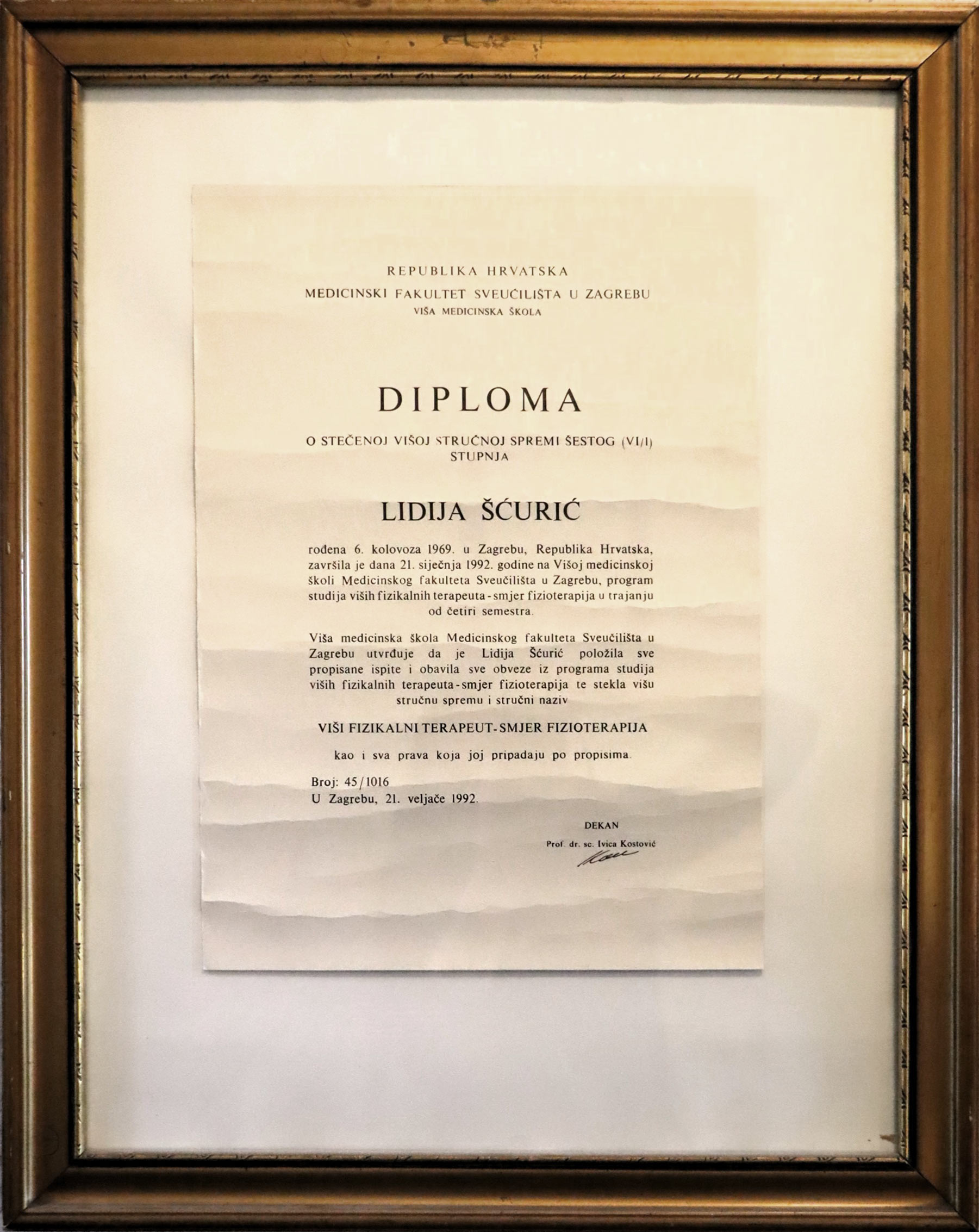 1992. - diplomirala sam pri Višoj medicinskoj školi Medicinskog fakulteta Sveučilišta u Zagrebu, studij fizioterapije