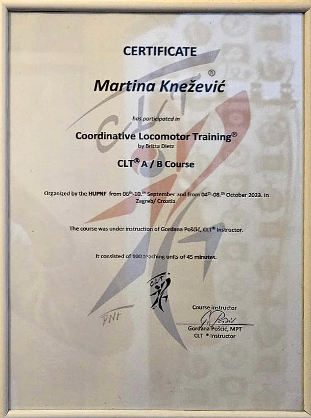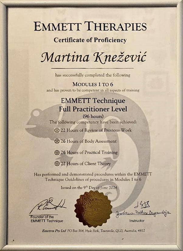 Tijekom svoje karijere, Martina je stekla dodatne vještine, uključujući diplomu Emmett terapeuta, praktično znanje u vođenju CLT terapijskog programa te manipulaciju cervikalnog dijela kralježnice u svrhu liječenja glavobolja.