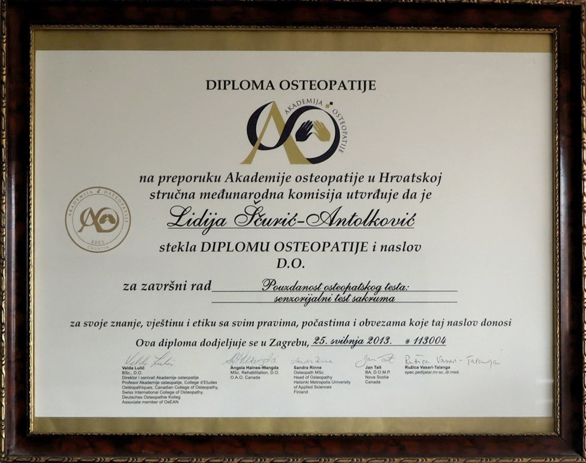 Osteopatija savršeno nadopunjuje moje znanje i vještine iz fizioterapije, komplementarna je znanstvenoj medicini i temelji se na načelima i zakonima anatomije i fiziologije.